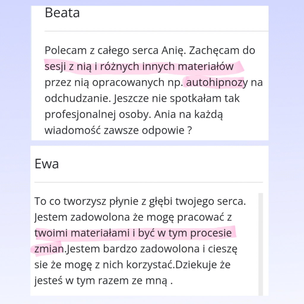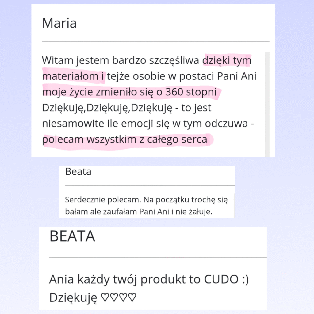 Od 2 lat pracuję z energią na 3 poziomach: myśli, emocji i traumy. Moje metody powstały na bazie dziesiątek sesji z klientkami takimi jak Ty. Tylko w tym roku przeprowadziłam ponad 500 sesji indywidualnych podczas których uczyłam moje klientki jak skutecznie zmieniać podświadome przekonania i uwalniać emocje.