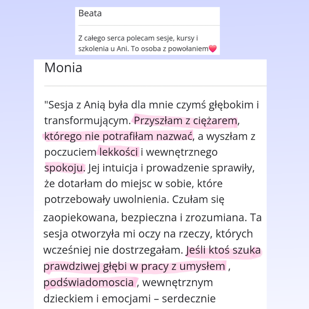 Od 2 lat pracuję z energią na 3 poziomach: myśli, emocji i traumy. Moje metody powstały na bazie dziesiątek sesji z klientkami takimi jak Ty. Tylko w tym roku przeprowadziłam ponad 500 sesji indywidualnych podczas których uczyłam moje klientki jak skutecznie zmieniać podświadome przekonania i uwalniać emocje.